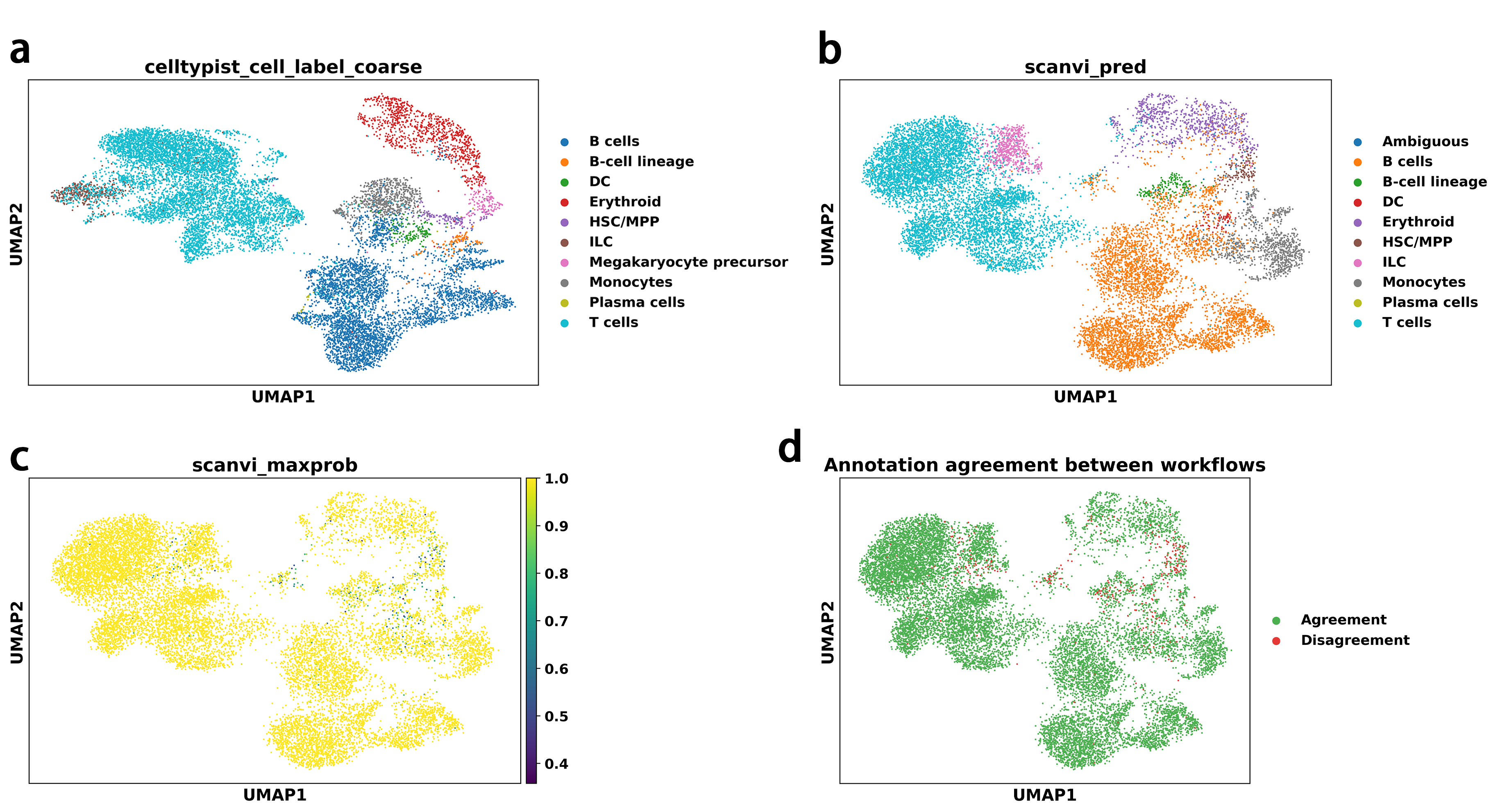 To further validate the robustness of the workflow at the level of cell type annotation, we compared annotation outcomes obtained from two complete analysis pipelines: a standard PCA-based workflow followed by automated CellTypist prediction, and a batch-aware semi-supervised workflow based on scVI and scANVI. This comparison was performed on a single-batch immune cell dataset to assess whether both workflows could produce coherent and biologically meaningful annotations under minimal technical confounding, as summarized in Figure4.