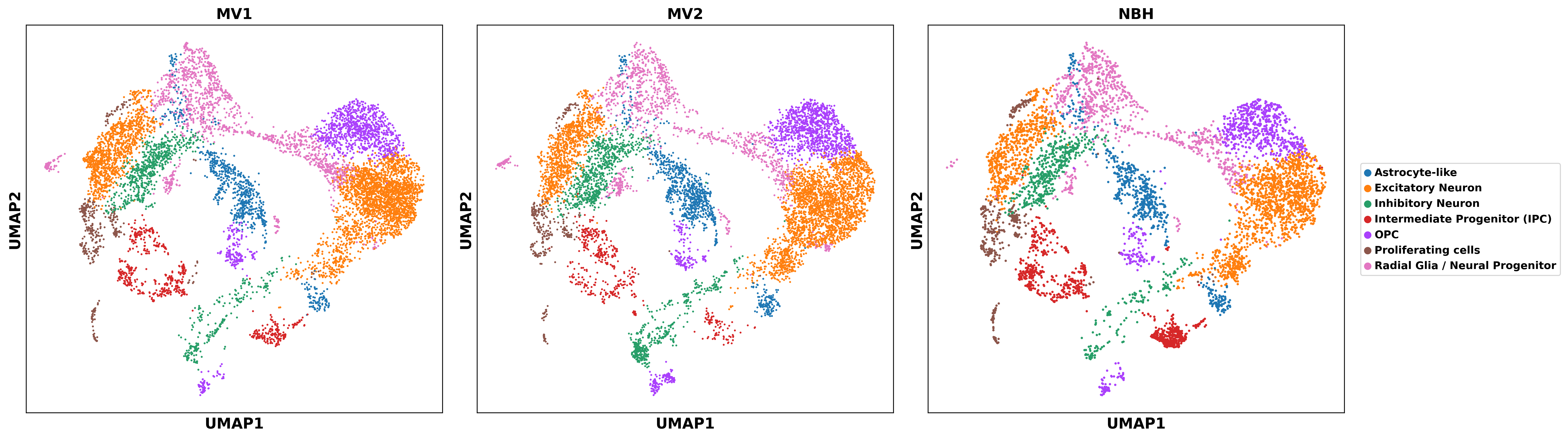 This annotation yielded seven major cell types with clear spatial separation in UMAP embeddings, as shown in Figure5. Quantitative comparison of cell type proportions revealed infection-specific shifts relative to the NBH control. Both MV1 and MV2 conditions exhibited a marked increase in excitatory neurons (41.1% in MV1 and 39.4% in MV2 versus 34.5% in NBH) and a corresponding decrease in intermediate progenitor cells (7.0% in MV1 and 5.2% in MV2 versus 13.8% in NBH) and proliferating cells (4.4% in MV1 and 3.4% in MV2 versus 5.9% in NBH). MV2 additionally showed an elevated proportion of inhibitory neurons (13.1% versus 9.9% in NBH). In contrast, astrocyte-like cells and OPCs displayed only modest changes across conditions.