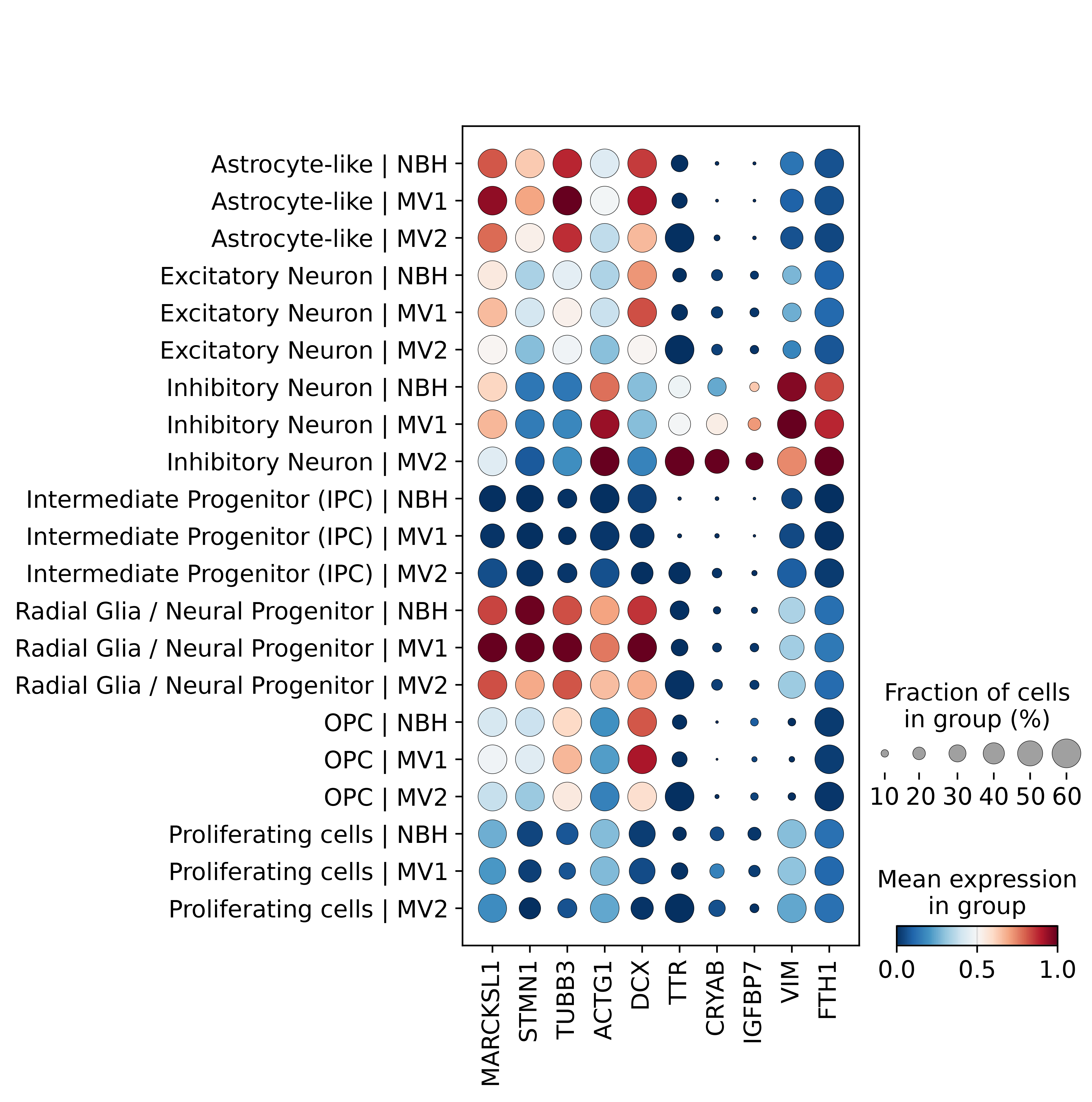 To establish a robust cellular framework for downstream analysis of infection-associated transcriptional changes, we performed unsupervised clustering and marker-based annotation on the integrated dataset comprising MV1, MV2, and NBH conditions. Using the scVI latent representation, we constructed a neighborhood graph and applied Leiden clustering (resolution = 0.8), followed by UMAP visualization. Major cell populations were identified based on established marker genes for human cerebral organoids and fetal brain development, including SOX2, NES, PAX6, and VIM for radial glia/neural progenitors; EOMES for intermediate progenitors; TBR1, SATB2, BCL11B, and CUX2 for excitatory neurons; GAD1 and GAD2 for inhibitory neurons; GFAP, AQP4, and SLC1A3 for astrocyte-like cells; PDGFRA, VCAN, and OLIG2 for oligodendrocyte precursor cells (OPCs); and MKI67 and TOP2A for proliferating cells.