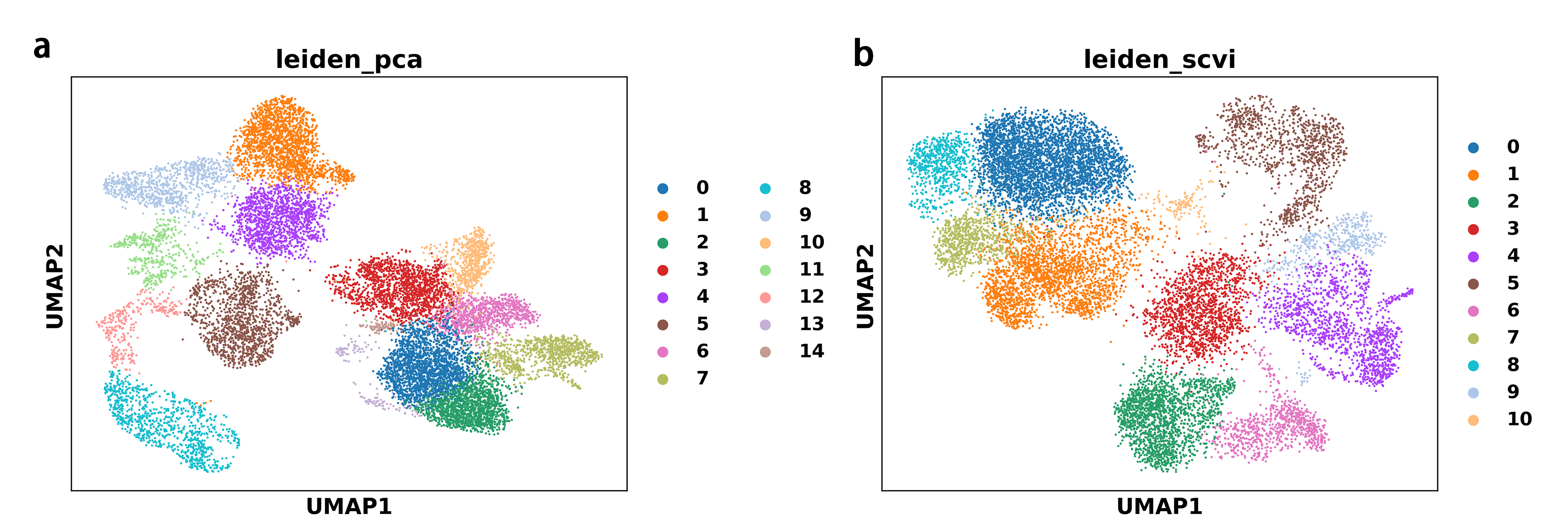 Low-dimensional representations learned through PCA (linear dimensionality reduction) and scVI (non-linear generative modeling) produced clear and biologically meaningful cellular clusters in the UMAP embeddings, shown in Figure3. The Leiden clustering results showed moderate similarity between the two approaches, with an estimated Adjusted Rand Index (ARI) of approximately 0.60. While PCA-based clustering yielded a larger number of clusters (15 vs. 11 for scVI) and finer subcluster separation, scVI-based clustering produced more compact clusters with sharper boundaries. These differences primarily arise from the distinct methodological properties of the two representation learning strategies—PCA captures maximal variance in a linear manner, whereas scVI models raw counts through a probabilistic framework that accounts for technical variability and non-linear relationships. Despite these variations in cluster number and boundary definition, the overall topological structure and major cell population distributions remained largely consistent, supporting the robustness of the workflow across different representation learning approaches.