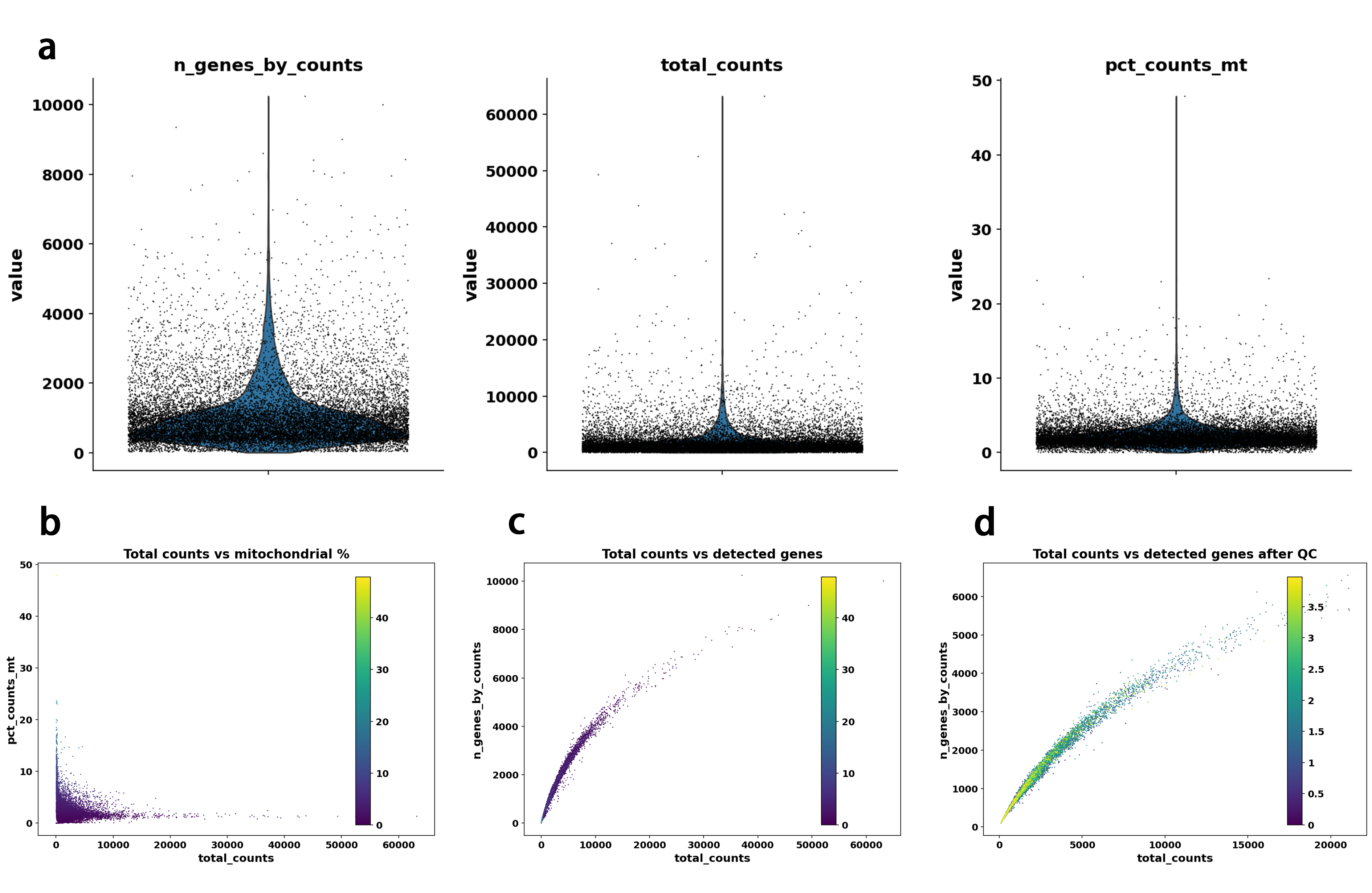 QC metrics were saved prior to filtering, and their distributions were visualized using violin plots and scatter plots to facilitate inspection of data quality and threshold selection.