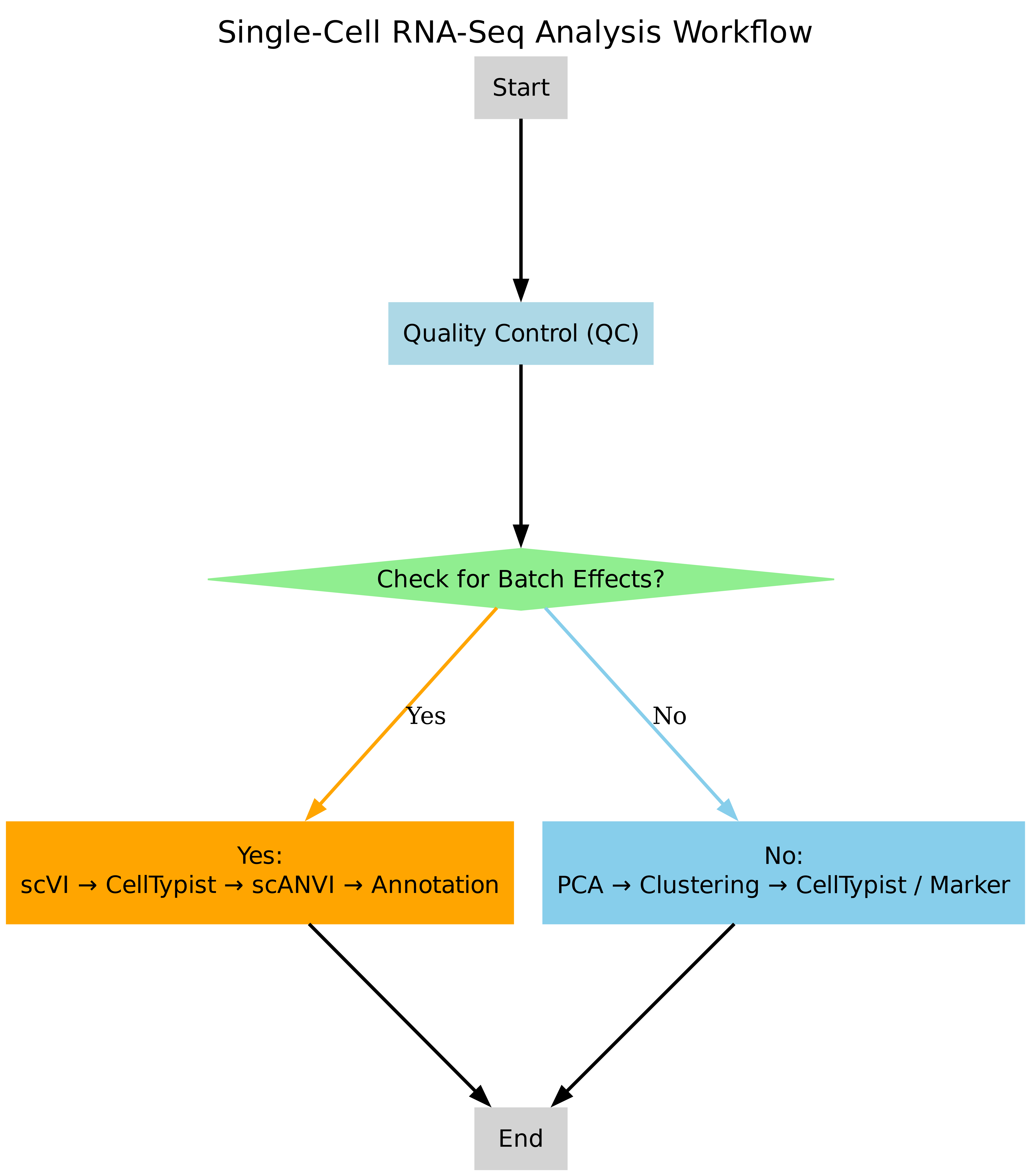 The overall workflow design, including both branches (with and without batch effects), is illustrated in Figure1. This adaptive workflow design enabled the selection of the most appropriate analytical strategy according to dataset characteristics, ensuring robust batch integration, reliable cell type annotation, and analytical consistency across different single-cell datasets processed during the study.
